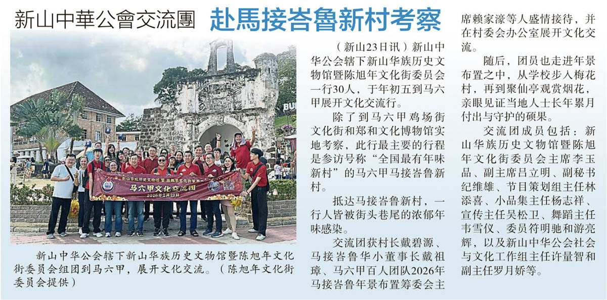 剪报 华族历史文物馆管理委员会 小组 / 委员会 新山陈旭年文化街委员会 最新活动 资料库 新山中华公会交流团-赴马接峇鲁新村考察 February 24, 2026February 24, 2026 gypsy 83 Views 星洲日报剪报
