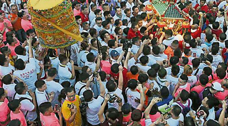 柔佛古庙众神回銮-信众合十喊“兴发”恭候
