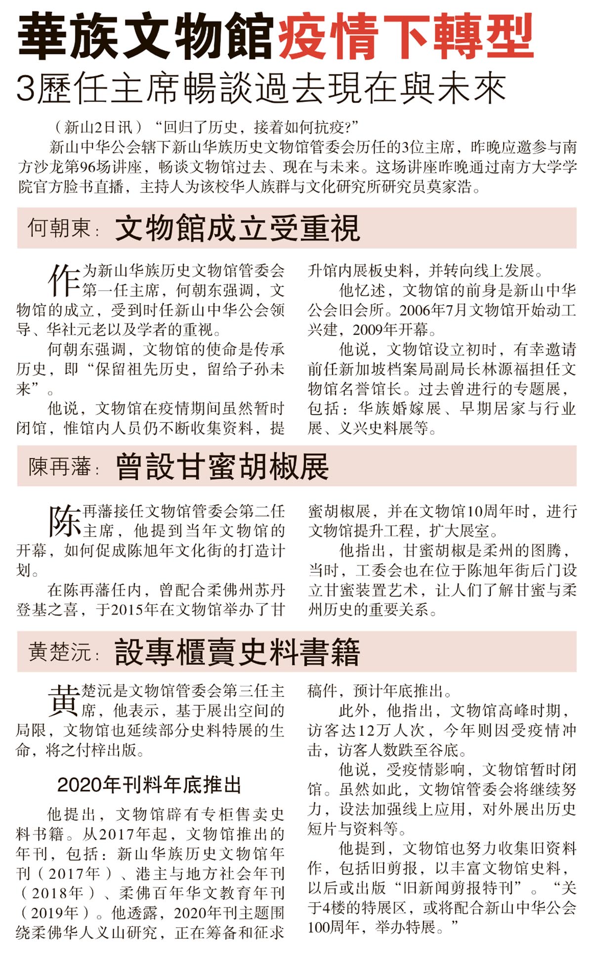 剪报 新山华族历史文物馆 本会服务 资料库 华族文物馆疫情下转型-3历任主席畅谈过去现在与未来 September 3, 2021February 8, 2022 gypsy 595 Views 星洲日报剪报