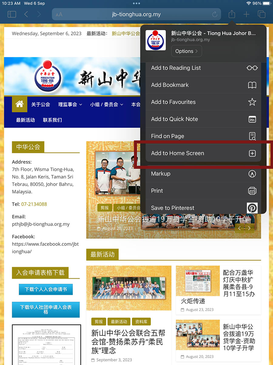 使用iOS内附的Safari游览器进入网站:https://www.jb-tionghua.org.my/main/