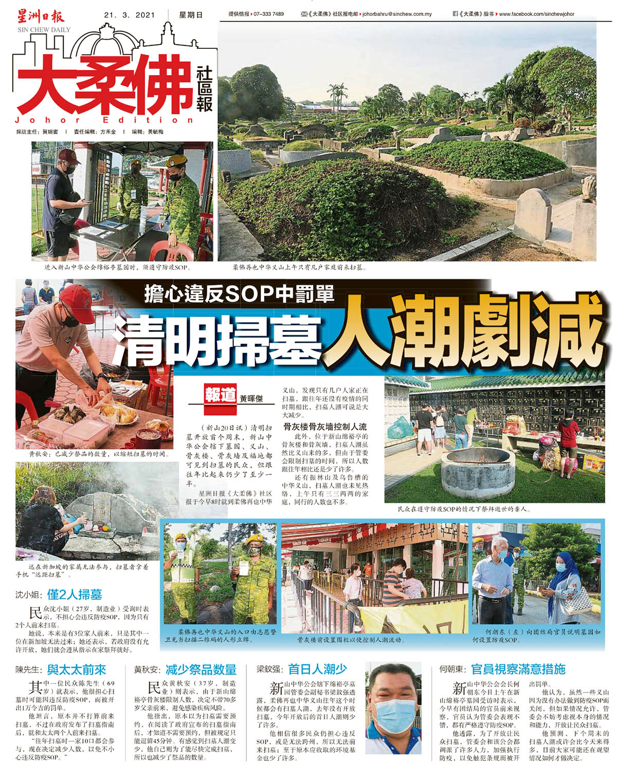 剪报 小组 / 委员会 绵裕亭墓园管理委员会 资料库 担心违反SOP中罚单-清明扫墓人潮遽减 March 21, 2021February 8, 2022 gypsy 1281 Views 星洲日报剪报