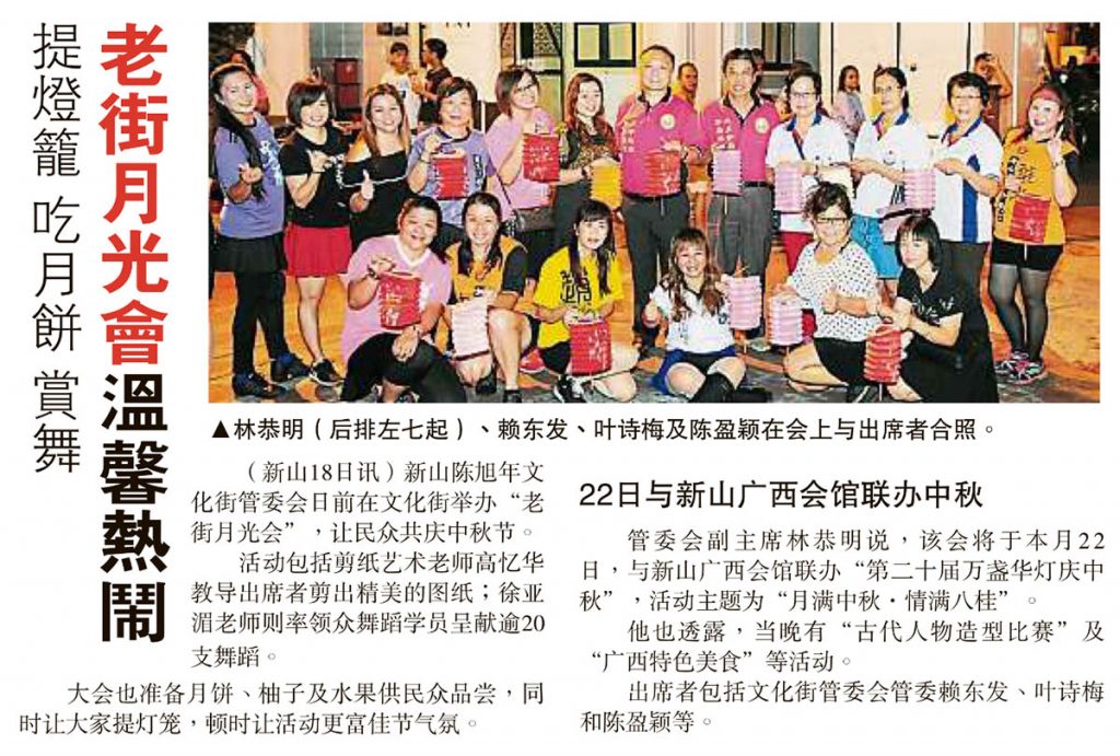 剪报 品牌活动 小组 / 委员会 新山陈旭年文化街委员会 资料库 陈旭年文化街 提灯笼吃月饼赏舞-老街月光会温馨热闹 September 19, 2018January 14, 2019 gypsy 2554 Views 星洲日报剪报