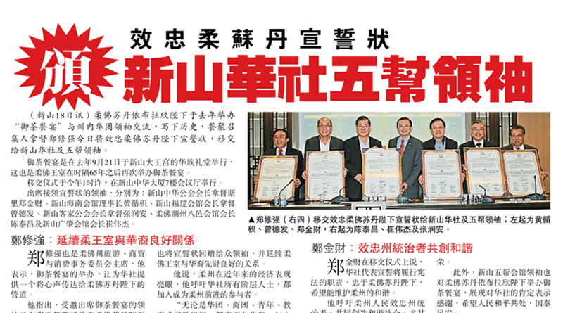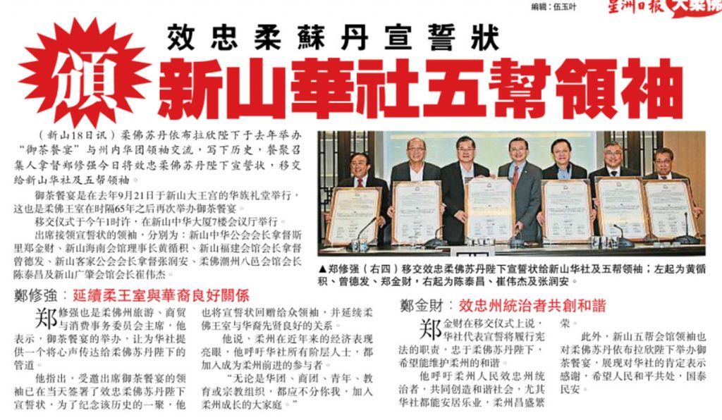 效忠柔苏丹宣誓状颁新山华社五帮领袖