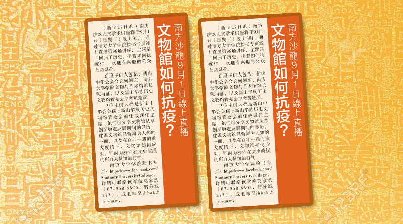 剪报 华族历史文物馆管理委员会 小组 / 委员会 新山华族历史文物馆 本会服务 资料库 文物馆如何抗疫?-南方沙龙9月1日线上直播 August 28, 2021February 8, 2022 gypsy 749 Views 星洲日报剪报