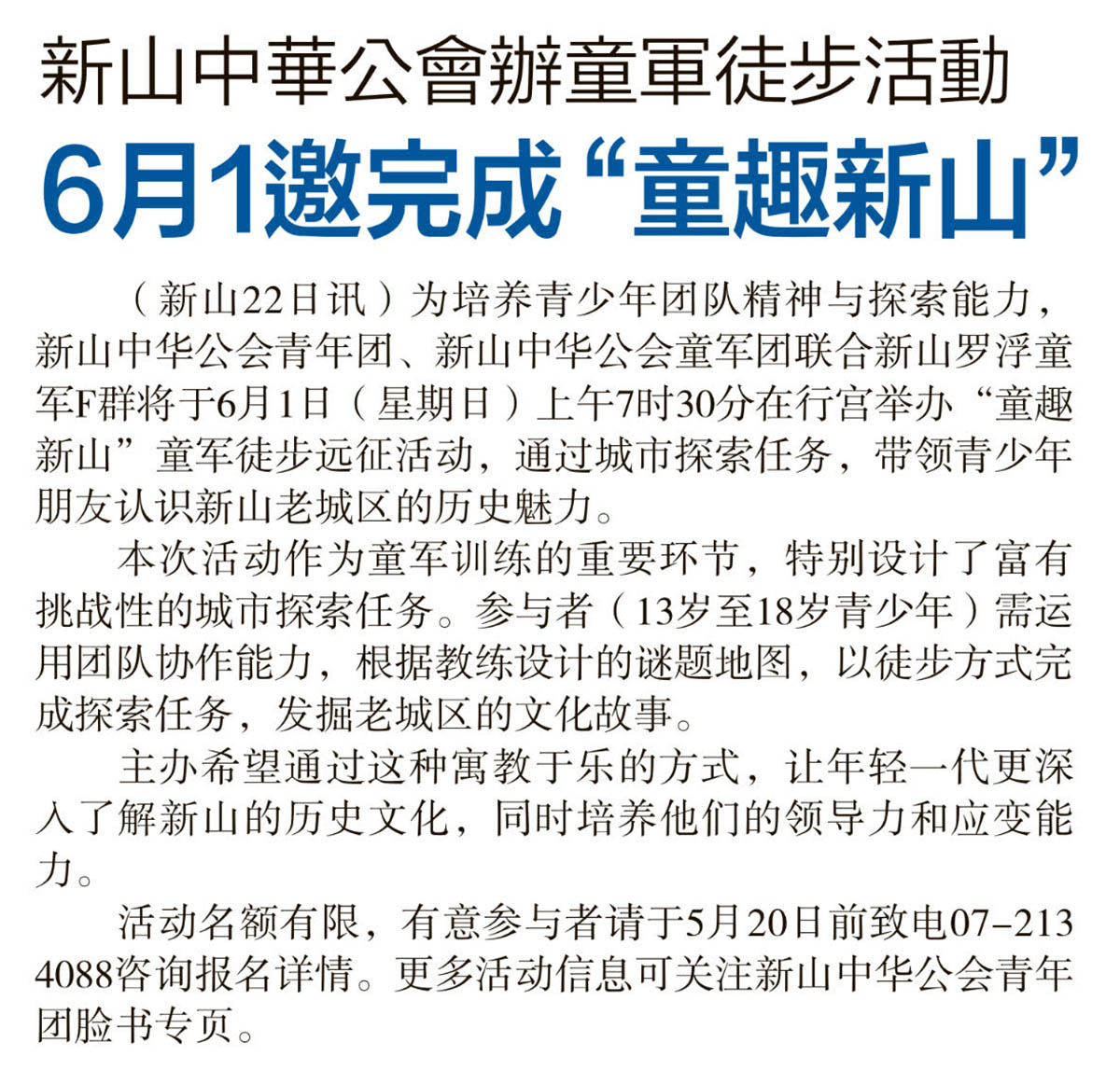 新山中华公会办童军徒步活动-6月1邀完成“童趣新山”