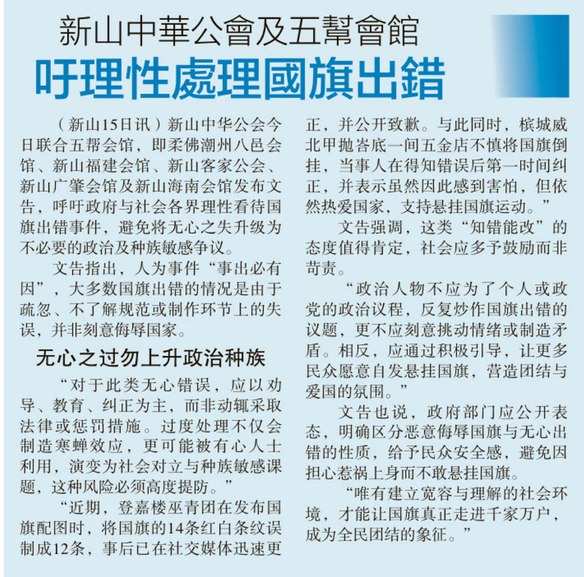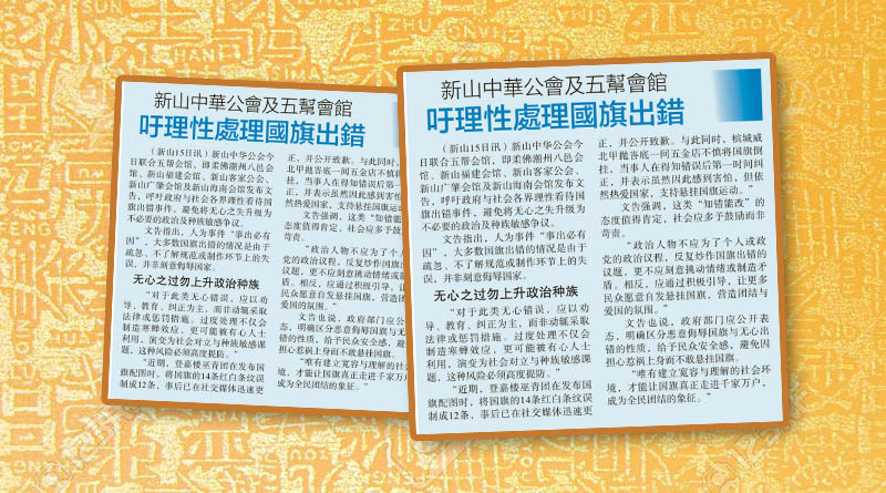 新山中华公会及五帮会馆-吁理性处理国旗出错