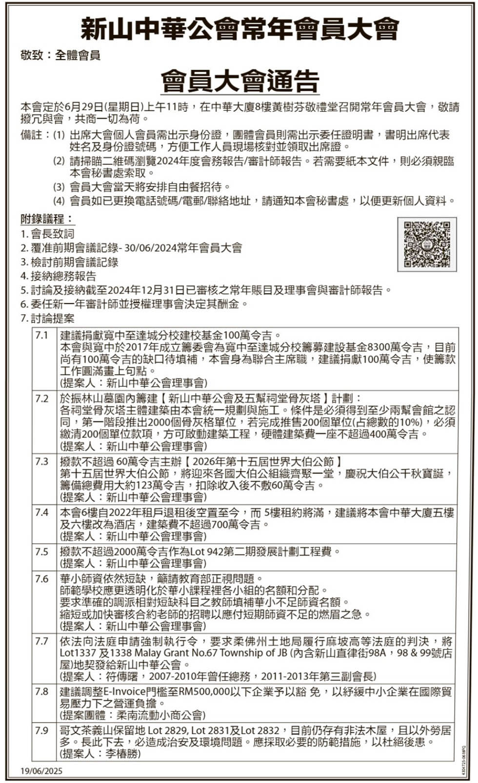 新山中华公会常年会员大会-会员大会通告