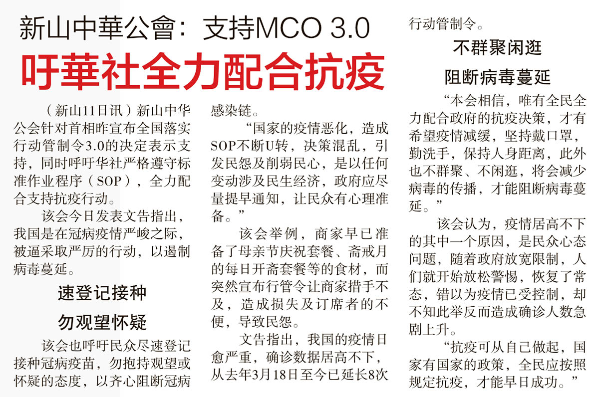 新山中华公会支持MCO3.0-吁华社全力配合抗疫