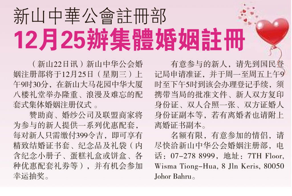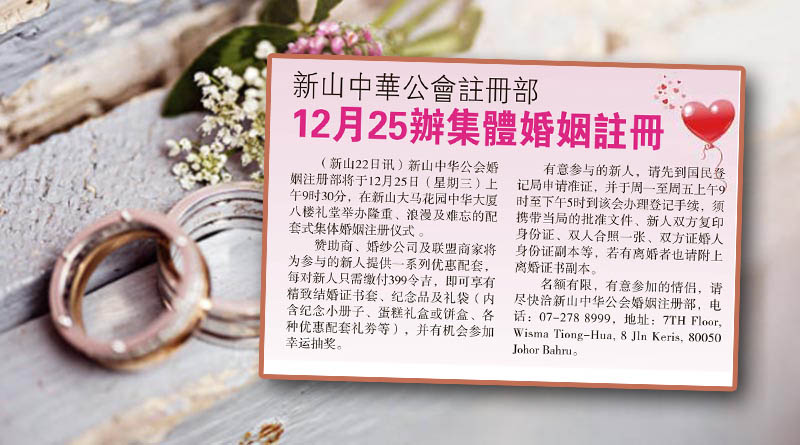新山中华公会注册部-12月25办集体婚姻注册