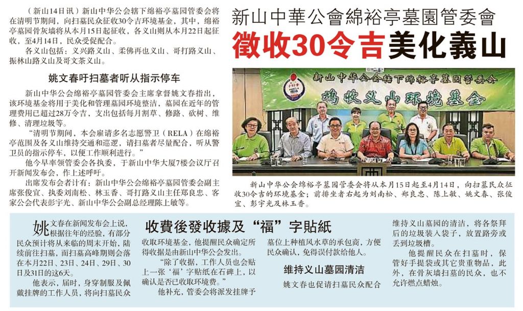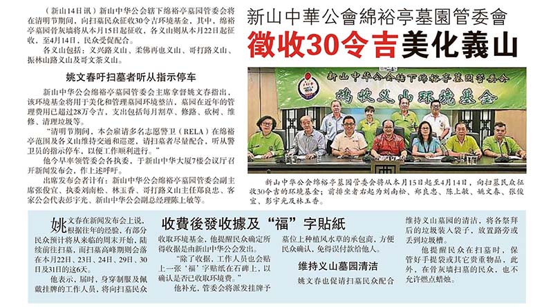 剪报 小组 / 委员会 绵裕亭墓园管理委员会 资料库 新山中华公会绵裕亭墓园管委会-征收30令吉美化义山 March 15, 2019July 5, 2019 gypsy 3415 Views 星洲日报剪报