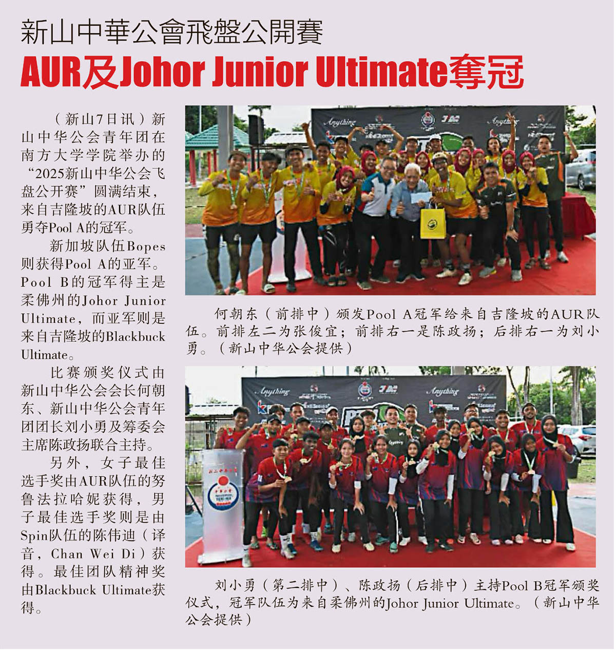 剪报 小组 / 委员会 最新活动 资料库 青年团 新山中华公会飞盘公开赛-AUR及Johor Junior Ultimate夺冠 January 8, 2025 gypsy 241 Views 星洲日报剪报