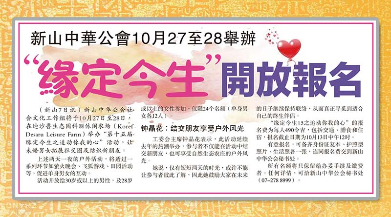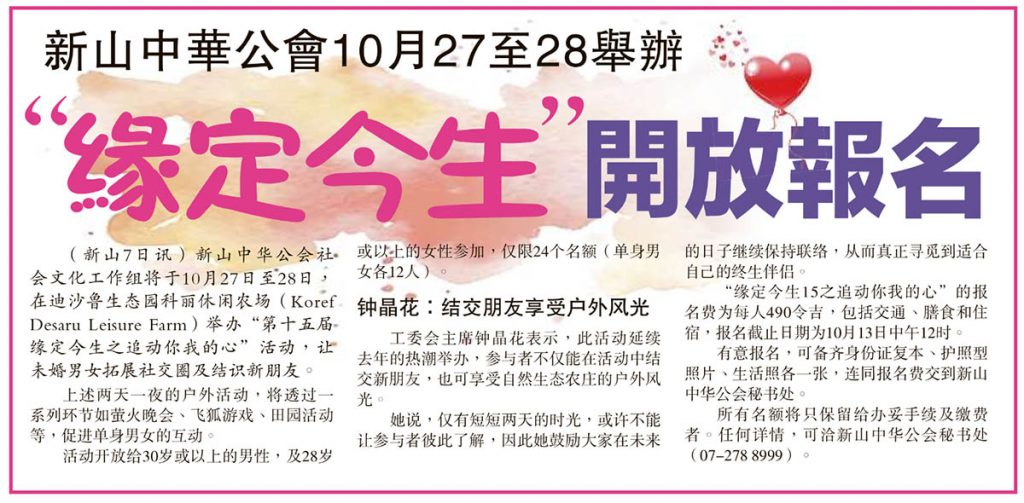 剪报 小组 / 委员会 社会文化工作组 资料库 新山中华公会10月27至28举办-“缘定今生”开放报名 September 8, 2018January 14, 2019 gypsy 2610 Views 星洲日报剪报