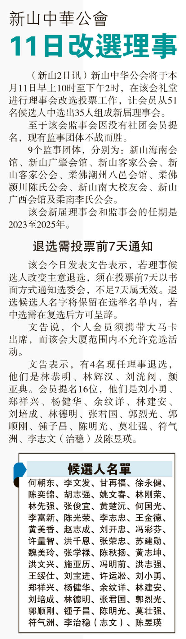 新山中华公会11日改选理事