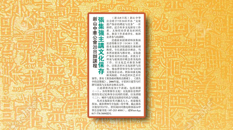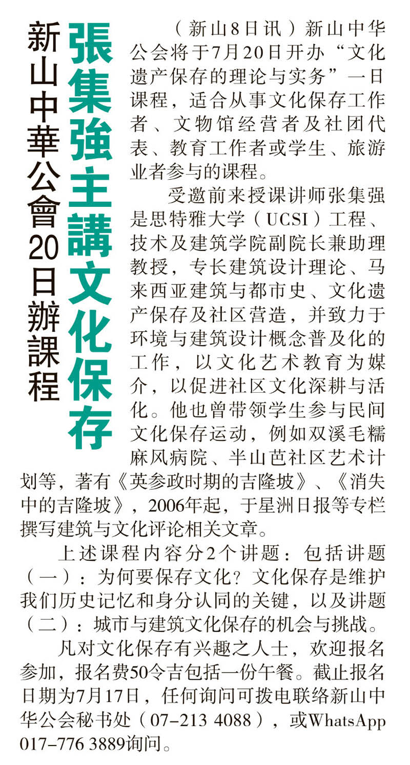 新山中华公会20日办课程-张集强主讲文化保存