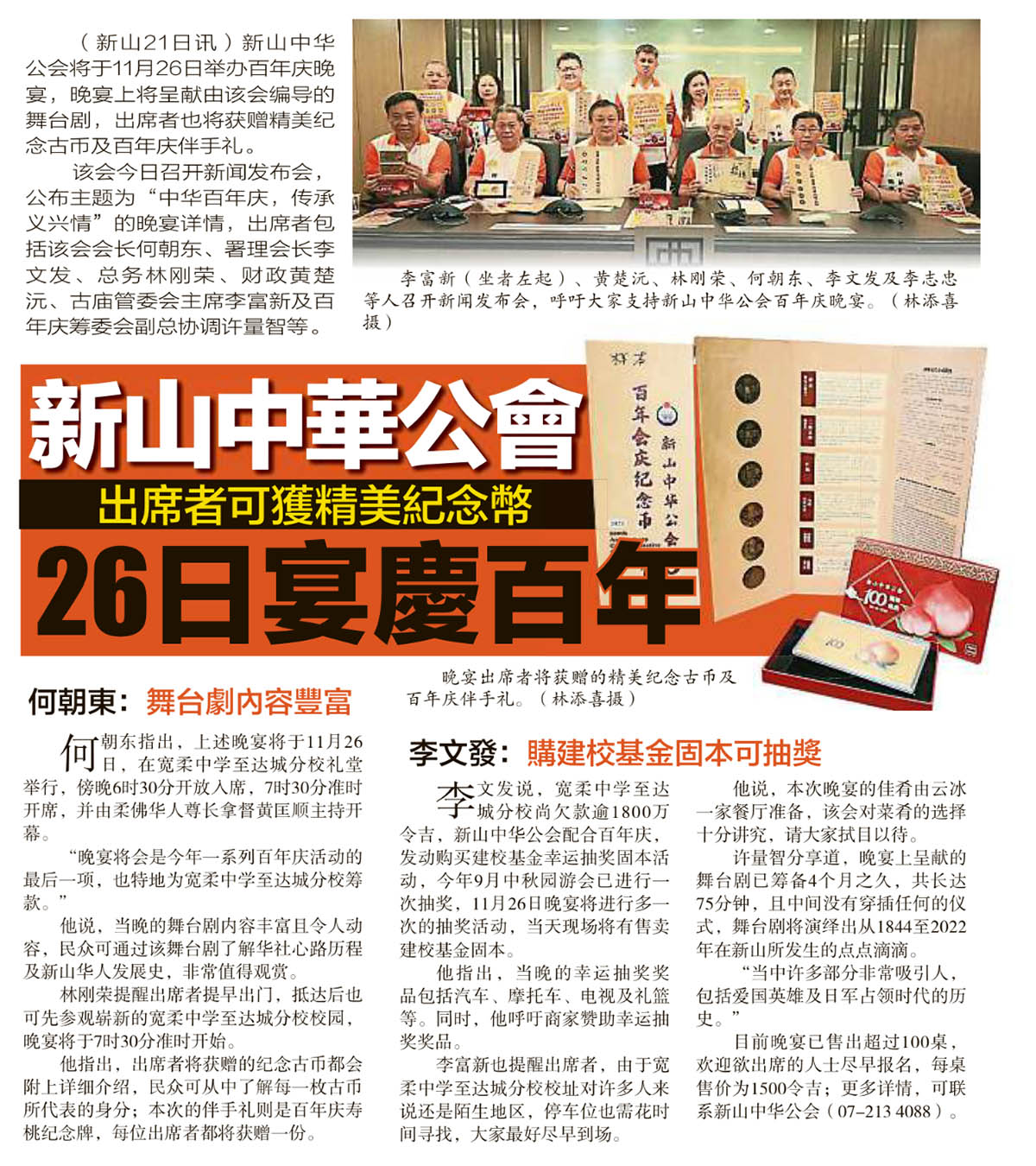 新山中华公会26日宴庆百年-出席者可获精美纪念币