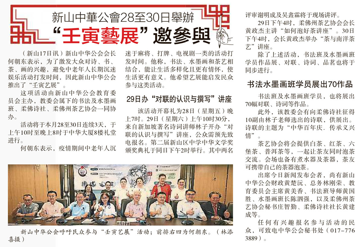 剪报 小组 / 委员会 教育委员会 资料库 新山中华公会28至30日举办-“壬寅艺展”邀参与 October 18, 2022January 2, 2023 gypsy 650 Views 星洲日报剪报