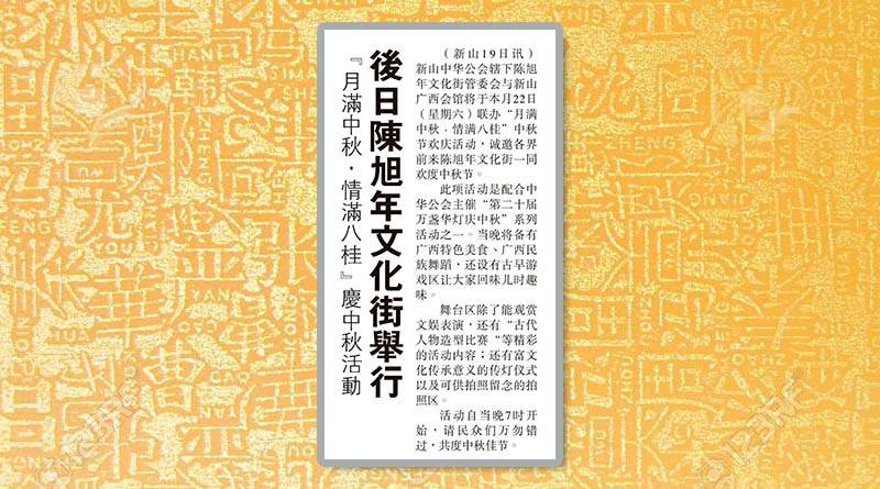 万盏华灯庆中秋 剪报 品牌活动 小组 / 委员会 新山陈旭年文化街委员会 资料库 “月满中秋情满八桂”庆中秋活动-后日陈旭年文化街举行 September 20, 2018January 14, 2019 gypsy 2031 Views 星洲日报剪报