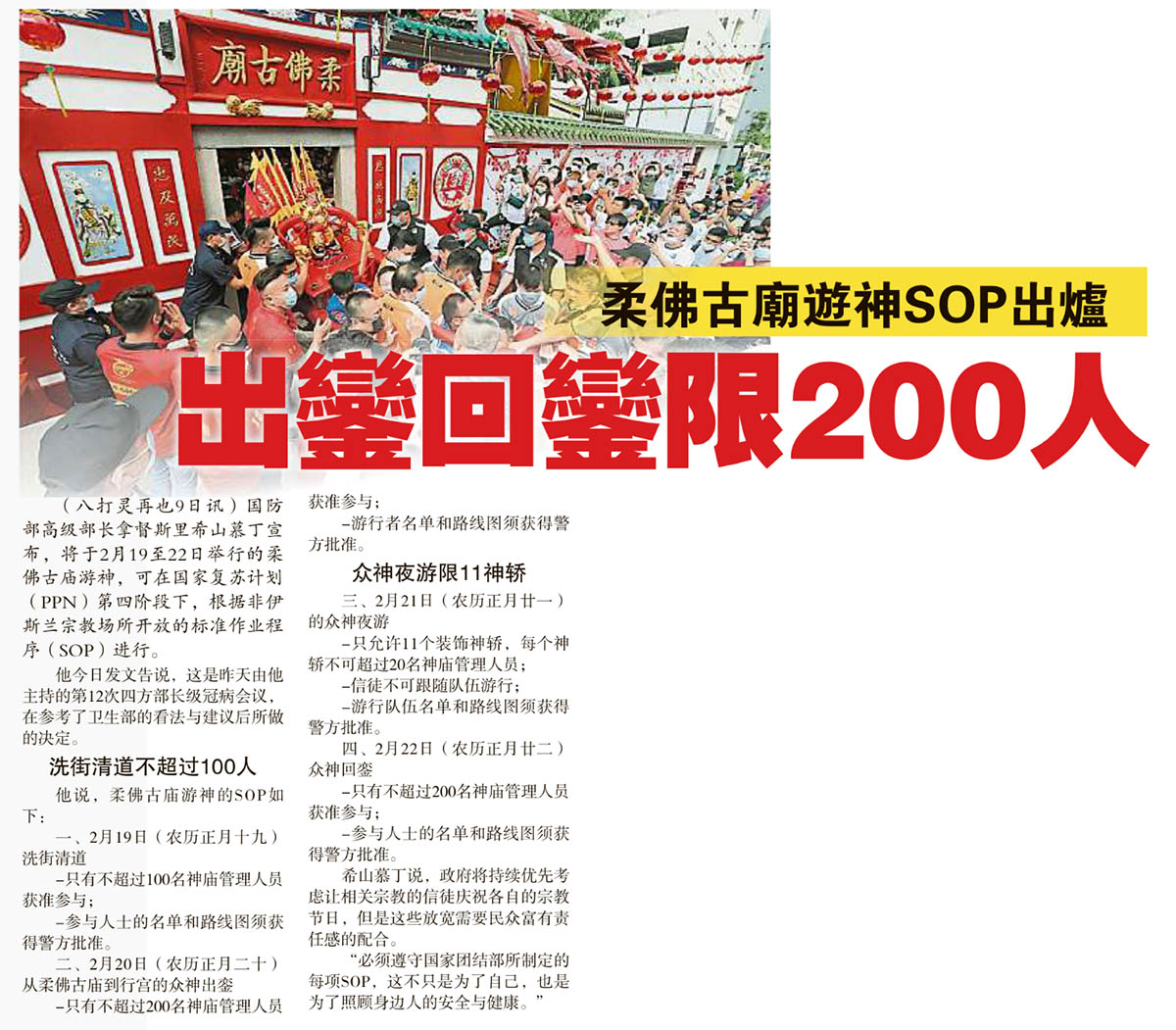 剪报 品牌活动 本会服务 柔佛古庙 柔佛古庙众神巡游 资料库 柔佛古庙游神SOP出炉-出銮回銮限200人 February 10, 2022June 22, 2022 gypsy 846 Views 星洲日报剪报