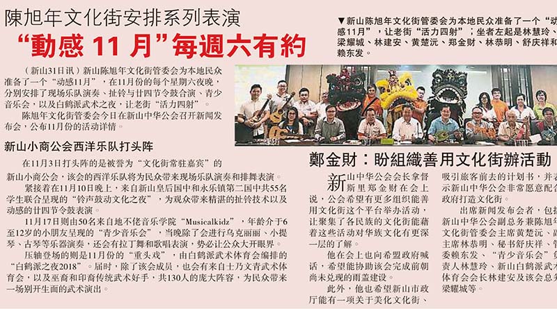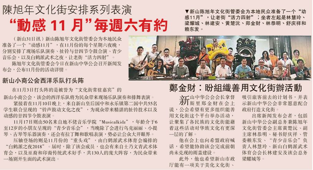 剪报 品牌活动 资料库 陈旭年文化街 陈旭年文化街安排系列表演-“动感11月每周六有约” November 1, 2018January 14, 2019 gypsy 1922 Views 星洲日报剪报