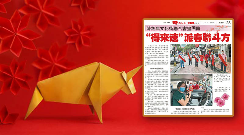 剪报 品牌活动 小组 / 委员会 新山陈旭年文化街委员会 资料库 陈旭年文化街 陈旭年文化街联合书画团体-“得来速”派春联斗方 February 11, 2021February 8, 2022 gypsy 996 Views 星洲日报剪报