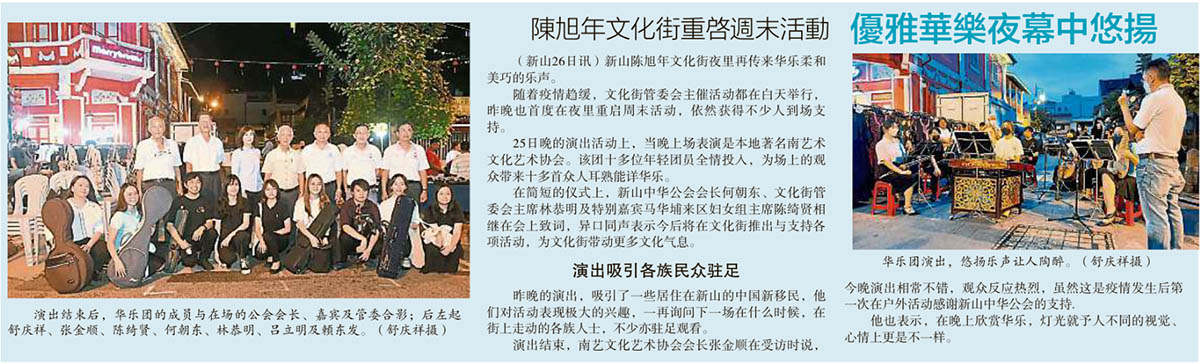 剪报 品牌活动 小组 / 委员会 新山陈旭年文化街委员会 资料库 陈旭年文化街 陈旭年文化街重启周末活动-优雅华乐夜幕中悠扬 June 27, 2022October 1, 2022 gypsy 667 Views 星洲日报剪报