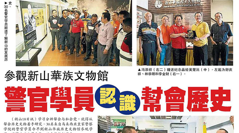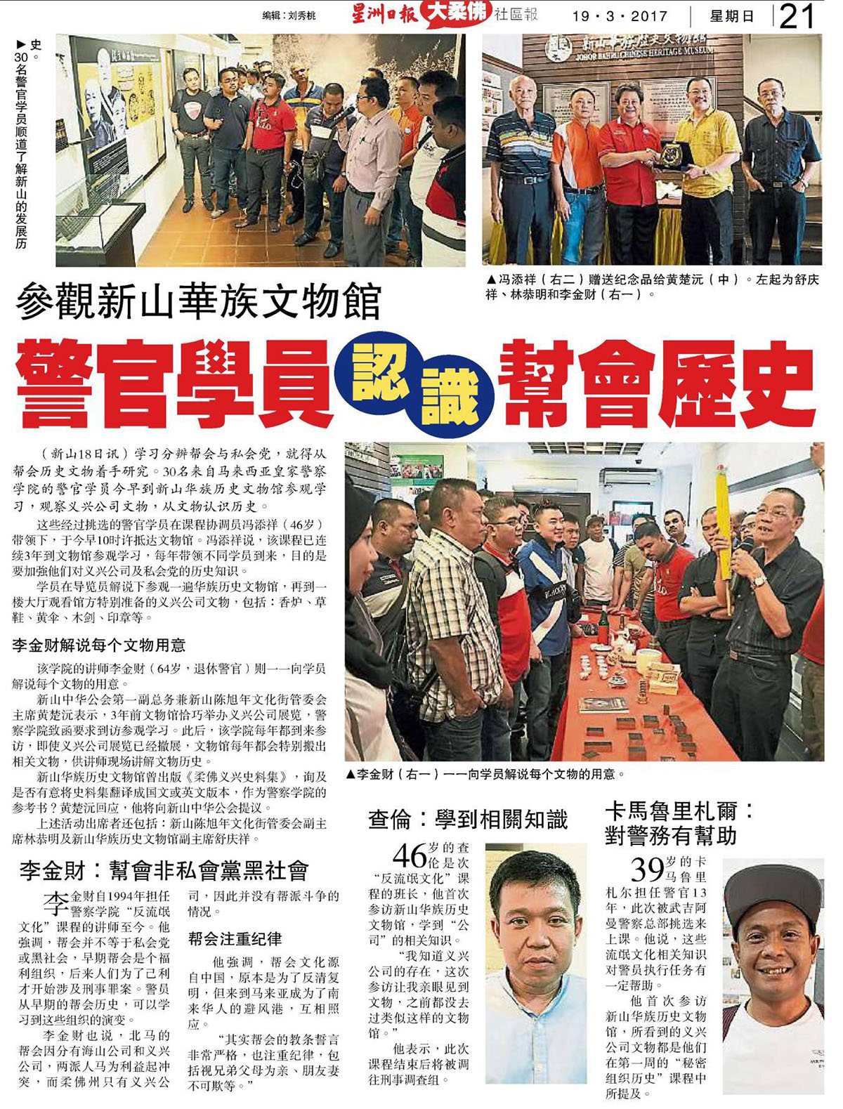 剪报 华族历史文物馆管理委员会 小组 / 委员会 活动记录 19-3-2017-剪报-参观新山华族文物馆-警官学员认识帮会历史 March 19, 2017August 29, 2017 gypsy 2730 Views