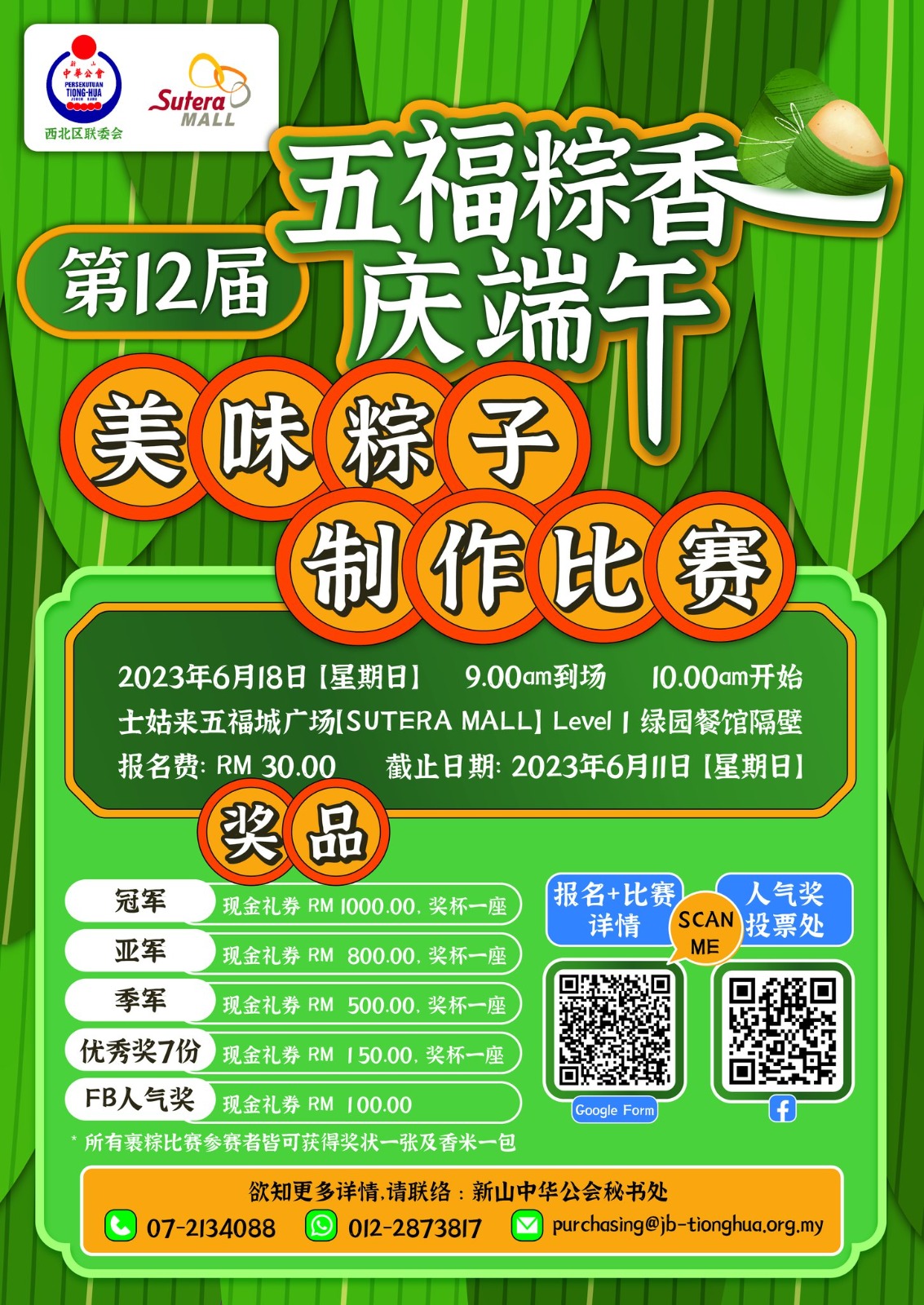 Uncategorized 2023年 第12届《五福粽香庆端午》美味粽子制作比赛 May 25, 2023January 12, 2024 gypsy 788 Views 一年一度的美味粽子制作比赛又回来囖😍!欢迎有兴趣参加的朋友们点击以下链接🔗获取参赛表格📋及了解比赛规章📲。 🏆2023年 第12届《五福粽香庆端午》美味粽子制作比赛 ✍报名表格及章则 https://forms.gle/cbLDKsGfBxuVg1yE9 欲知更多详情,可拨打 07-2134088 或是 电邮至 purchasing@jb-tionghua.org.my 或是 WhatsApp至 012-2873817 ♥