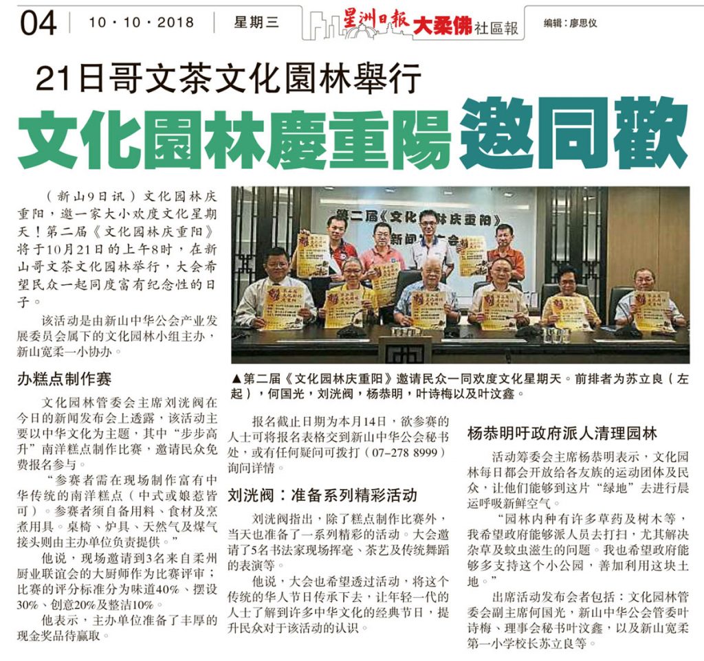 产业投标及工程委员会 剪报 小组 / 委员会 资料库 21日哥文茶文化园林举行-文化园林庆重阳邀同欢 October 10, 2018January 14, 2019 gypsy 2668 Views 星洲日报剪报