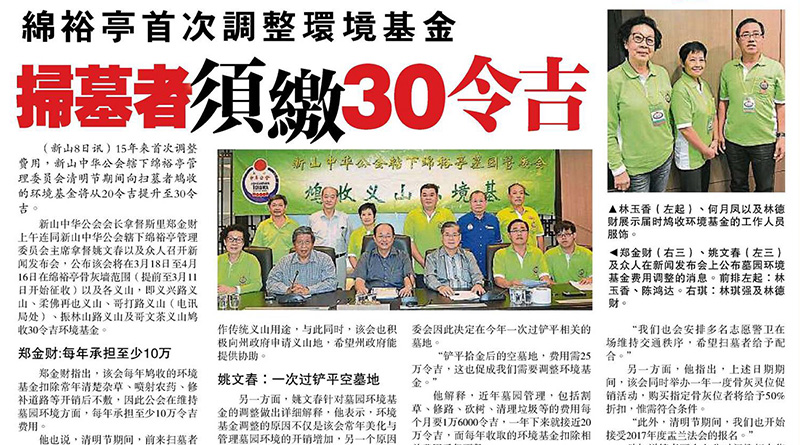 剪报 小组 / 委员会 活动记录 绵裕亭墓园管理委员会 9-3-2017-剪报-绵裕亭首次调整环境基金-扫墓者须缴30令吉 March 9, 2017August 29, 2017 gypsy 2653 Views